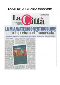 Roberto Di Egidio è autore della raccolta di poesie “La mia Waterloo ventncolare” (apparsa per i tipi della intraprendente e benemerita Neo Edizioni, pp. 142, Euro 10) ed è soprattutto uno che sa scrivere, nel senso che ha qualcosa da dire e sa come dirlo. Non è poco, tanto più se si tiene conto della “giovane” età del nostro, nato negli anni ’70 in Abruzzo (non si sa però dove). Ma tagliamo corto: molte delle poesie di Di Egidio sono bellissime. Bellissime per quello che dicono e per come lo dicono, per la loro capacità di essere nuove e lievi senza risultare manierate, originali senza suonare finte, autentiche senza apparire forzate. Di EgIdio la sua poesia la fa con la pelle, stando nel mondo di oggi, al passo con i tempi, con la contemporaneità. Ecco “Shampo”: «galleggia I nella vasca da bagno / in direzione della parte emersa / delle mie ginocchia / ribattezzate per l’occasione / scilla e cariddi / il flacone quasi vuoto dello shampoo / ma il moto ondoso / che ne accelera l’incedere / non è provocato dai miei / peraltro Impercettibili movimenti / quanto dal fenomeno sismico / cbe da circa trenta secondi / interessa buona parte del centro sud della penisola / mia madre mi implora / da dietro la porta / di ripararini sotto lo stipite / prevenendo così le conseguenze / di un imminente crollo / ma io / nemmeno le rispondo / preso come sono / dalle sorti di questo naviglio di plastica / prossimo ormai al baratro / che si apre tra i due mostri».